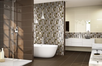 Mosaïque sophistiquée en verre aux tons beige et chocolat avec aluminium brossé effet cuivre. Elle peut être combinée avec nos bases Cosmopolitan Beige et Brown.