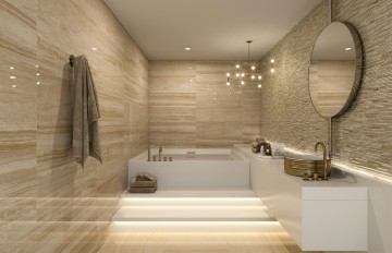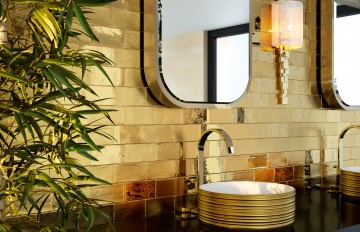 Lavabo rond en céramique avec PVD inspiré du cou des femmes girafes. Intérieur satiné blanc et extérieur doré. Idéal pour les salles de bain modernes.